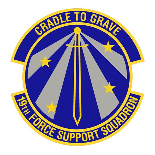 Custom patches for the 19th Force Support Squadron at Little Rock Air Force Base, Arizona. Our 19 FSS patches are 100% embroidered with Velcro backing.