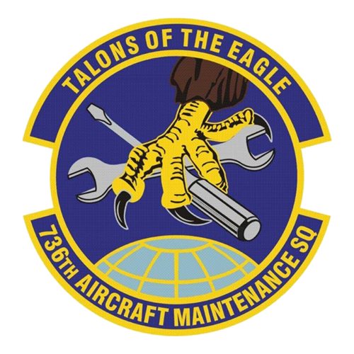 Custom patches for the 736th Aircraft Maintenance Squadron at Dover Air Force Base, Delaware. Your 736 AMXS patches are 100% embroidered with Velcro backing.