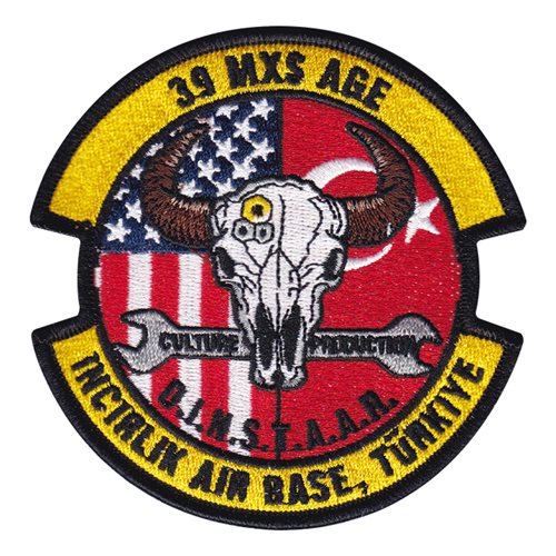 Custom patches for the 39th Maintenance Squadron at Incirlik Air Base, Turkey. Our 39 MXS patches are 100% embroidered with Velcro backing.