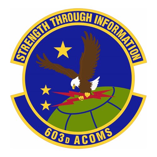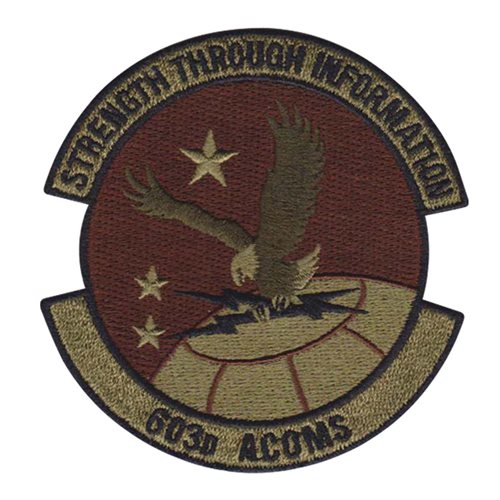 Custom patches for the 603rd Air Communications Squadron at Ramstein Air Base, Germany. Our 603 ACOMS patches are 100% embroidered with Velcro backing.