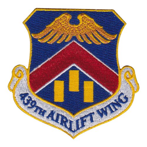 Custom patches for the 439th Airlift Wing at Westover Air Reserve Base. Our 439 AW patches are 100% embroidered with Velcro backing.