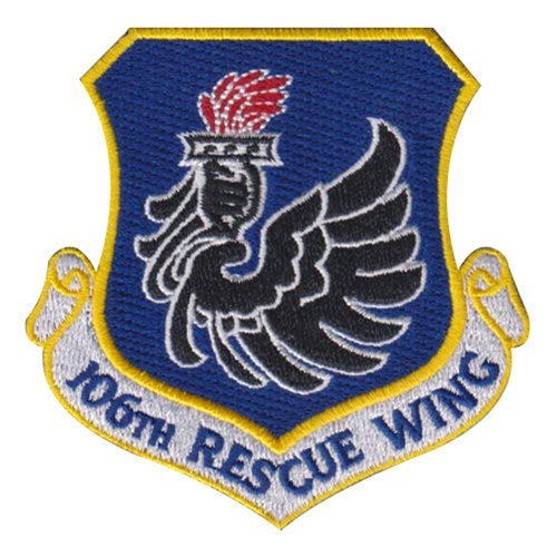 Custom patches for the 106th Rescue Wing at Francis S. Gabreski Air National Guard Base, New York. Our 106 RQW NY ANG patches are 100% embroidered with Velcro backing.
