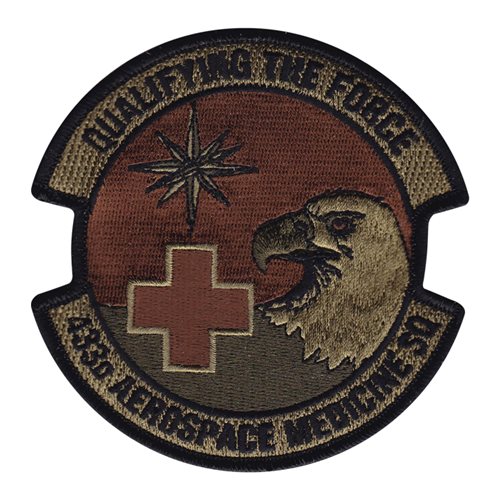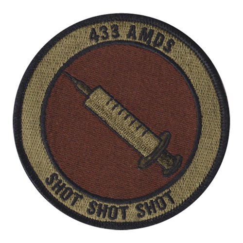 Custom patches for the 433rd Aerospace Medicine Squadron at Lackland Air Force Base, Texas. Your 433 AMDS patches are 100% embroidered with Velcro backing.