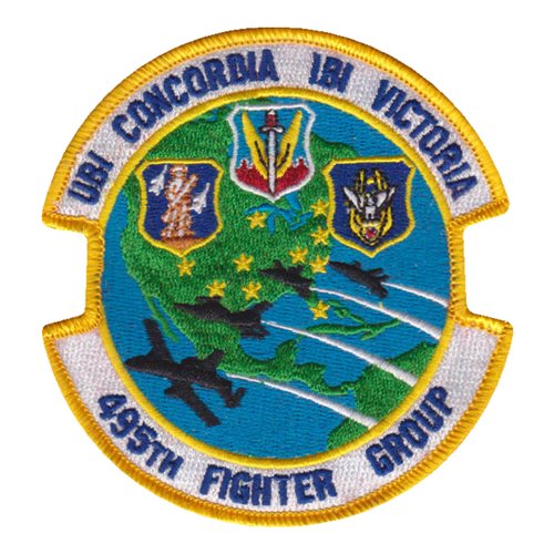 Custom patches for the 495th Fighter Group at Shaw Air Force Base, South Carolina. Our 495 FG patches are 100% embroidered with Velcro backing.